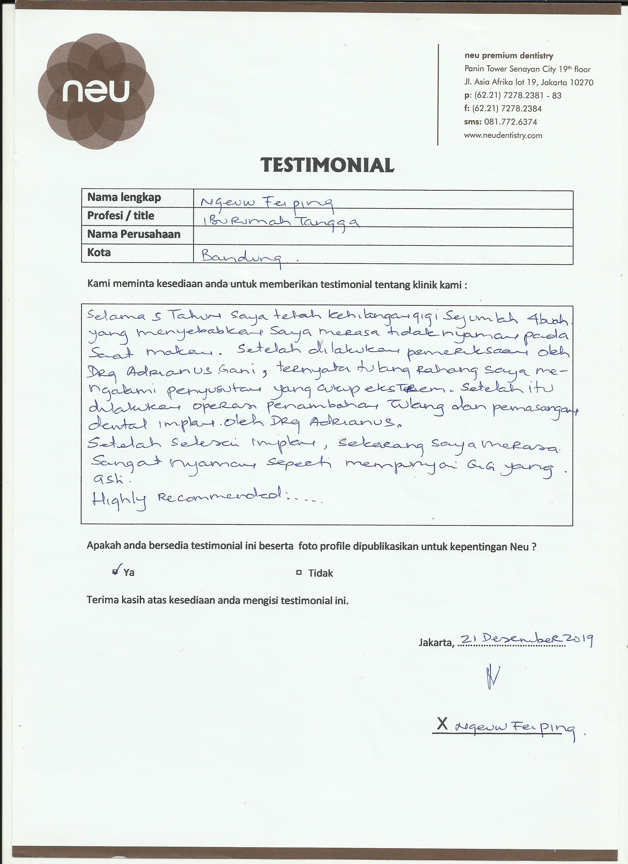 Saya sudah 8 tahun mempercayakan perawatan gigi saya kepada Dr. Andri/ Neu Dental. Yang saya suka mau apapun/ treatment apa saja saya tidak merasa takut, karena betul-betul tidak ada rasa sakit atau tidak nyaman. Yang saya suka adalah selain dokternya yang baik, juga alat-alat dan fasilitasnya super canggih. Mau separah apapun kondisi gigi kita, pasti ter-handle dan painless. sukses selalu untuk neu.