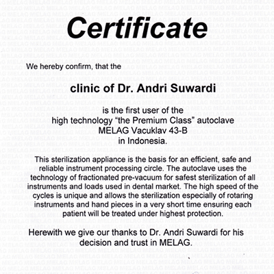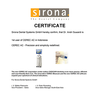 Dr. Andri have use Cerec AC in Indonesia since 2007 and now Sirona Dental Systems GmbH has officially acknowleged that Dr. Andri Suwardi from neu premium dentistry, Senayan City, Jakarta - Indonesia as the first user of Cerec AC in Indonesia. ... Read More
