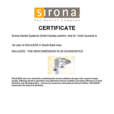 Dr. Andri have use GALILEOS 3D X-Ray 2007 and now Sirona Dental Systems GmbH has officially acknowleged that Dr. Andri Suwardi from neu premium dentistry, Senayan City, Jakarta - Indonesia as the first user of GALILEOS 3D X-Ray in South East Asia. GALILEOS sets new standards combini ... Read More