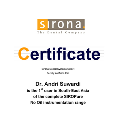Sirona Dental Systems GmbH hereby confirms that Dr. Andri Suwardi is the 1st user in South-East Asia of the complete SIROPure No Oil instrumentation range Following the example set by the automotive and pharmaceutical industries, Sirona has come up with the perfect solution. The com ... Read More