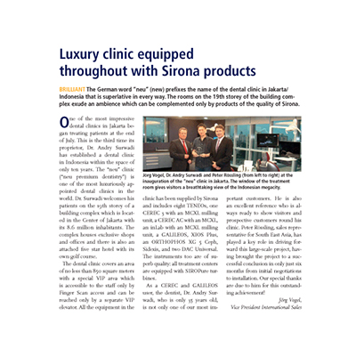 Insight The Sirona Employee newsletter Issue 38 October 2011   Brilliant The German word “neu” (new) prefixes the name of the dental clinic in Jakarta/ Indonesia that is superlative in every way. The rooms on the 19t ... Read More