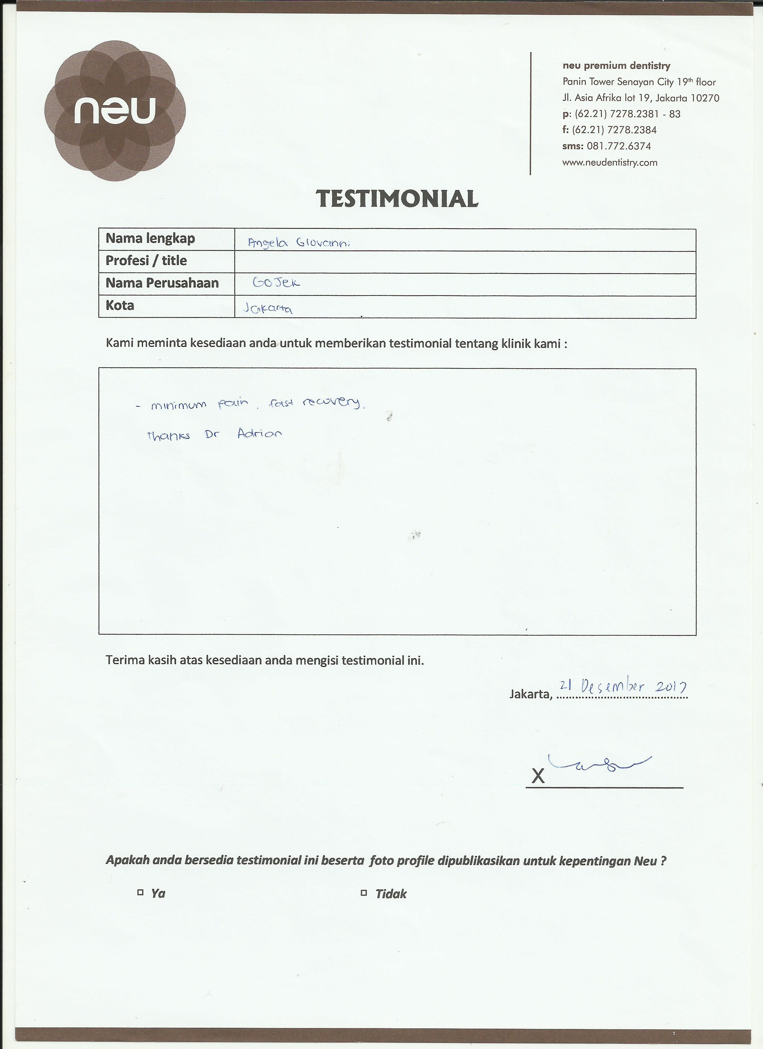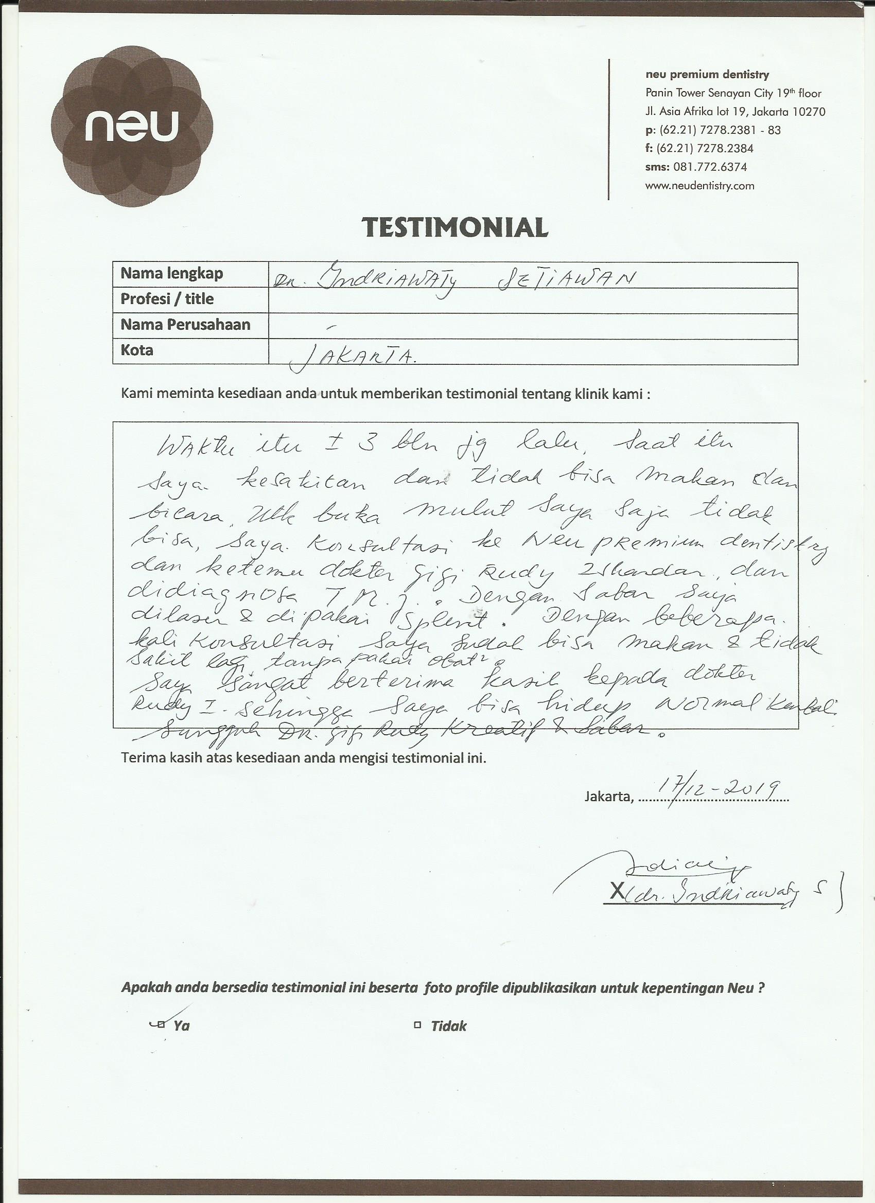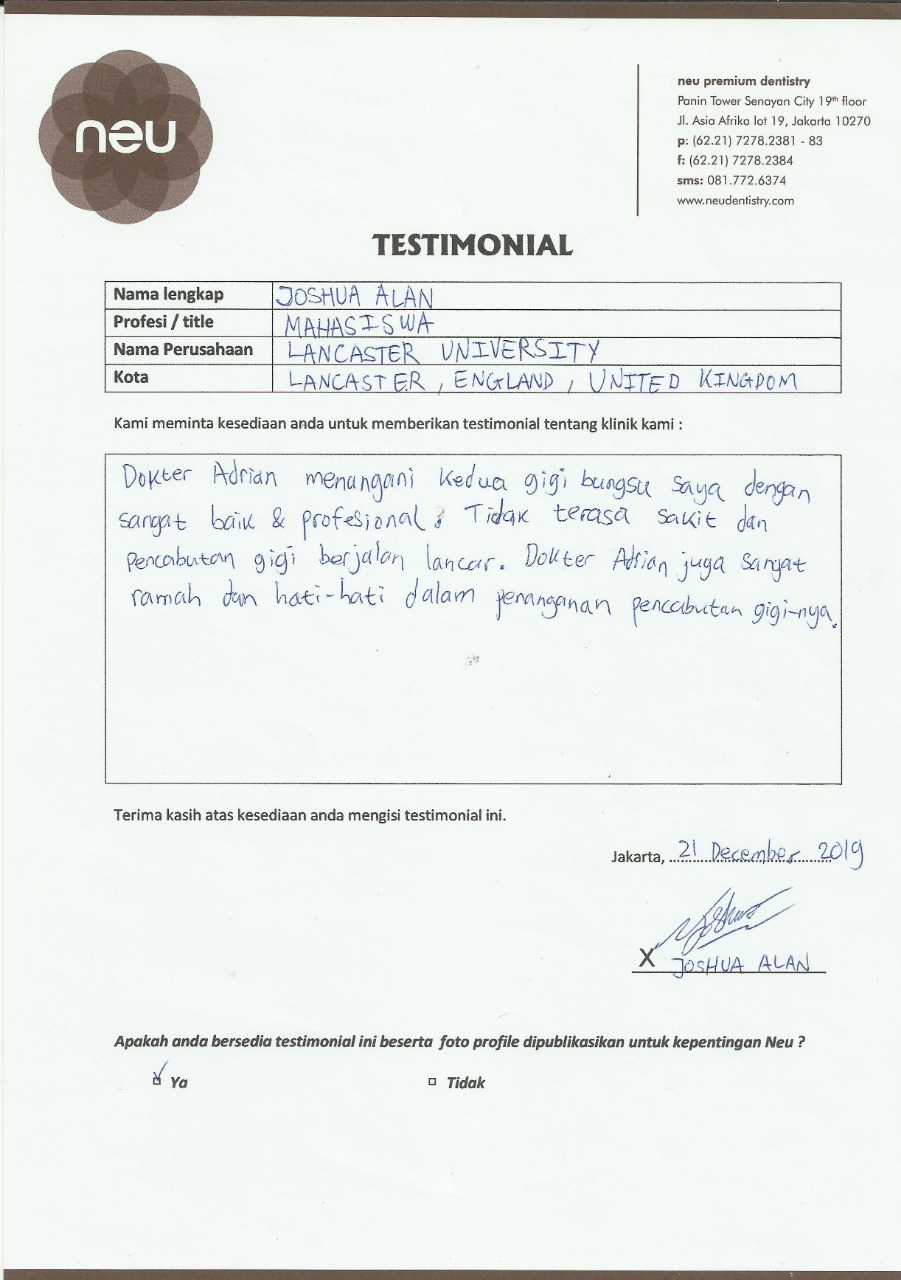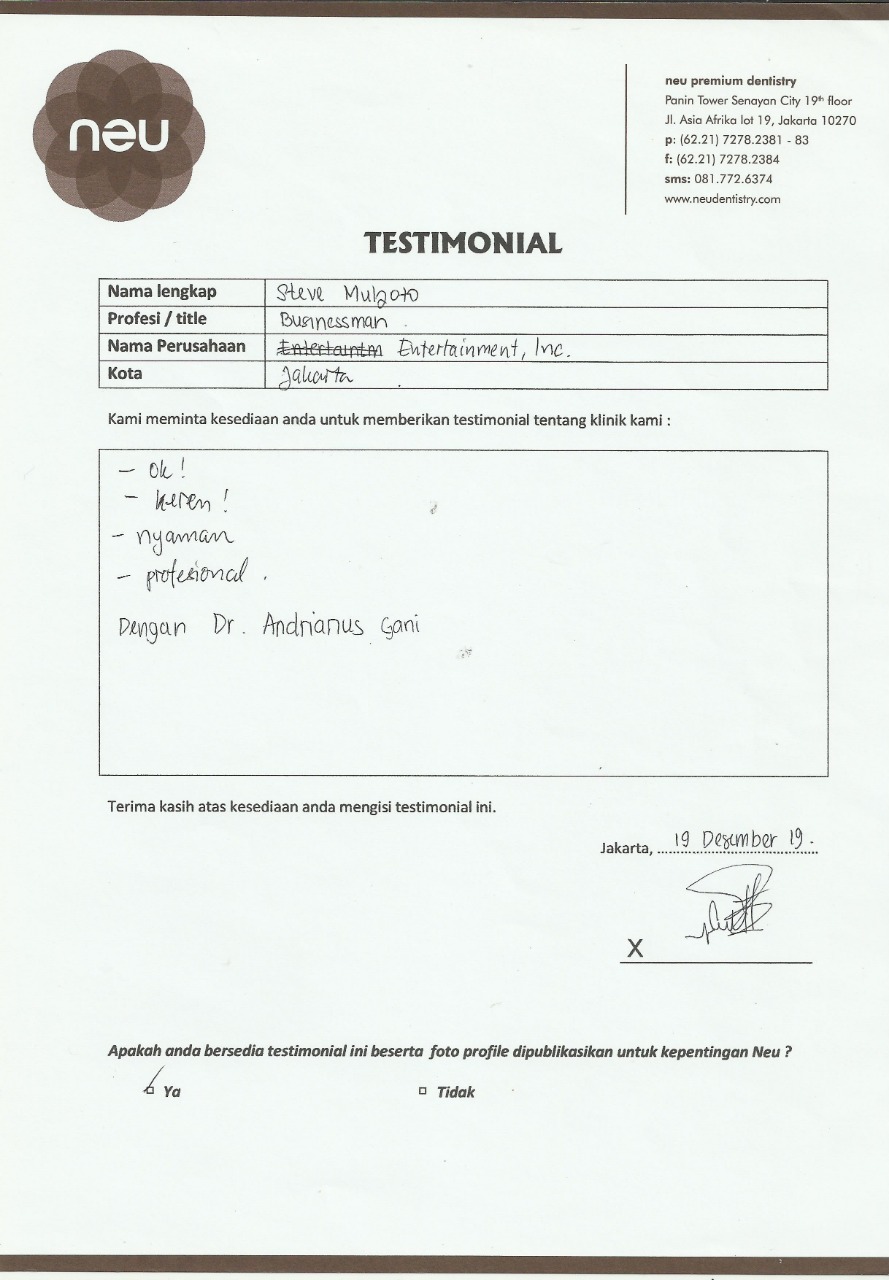 Saya sudah 8 tahun mempercayakan perawatan gigi saya kepada Dr. Andri/ Neu Dental. Yang saya suka mau apapun/ treatment apa saja saya tidak merasa takut, karena betul-betul tidak ada rasa sakit atau tidak nyaman. Yang saya suka adalah selain dokternya yang baik, juga alat-alat dan fasilitasnya super canggih. Mau separah apapun kondisi gigi kita, pasti ter-handle dan painless. sukses selalu untuk neu.
